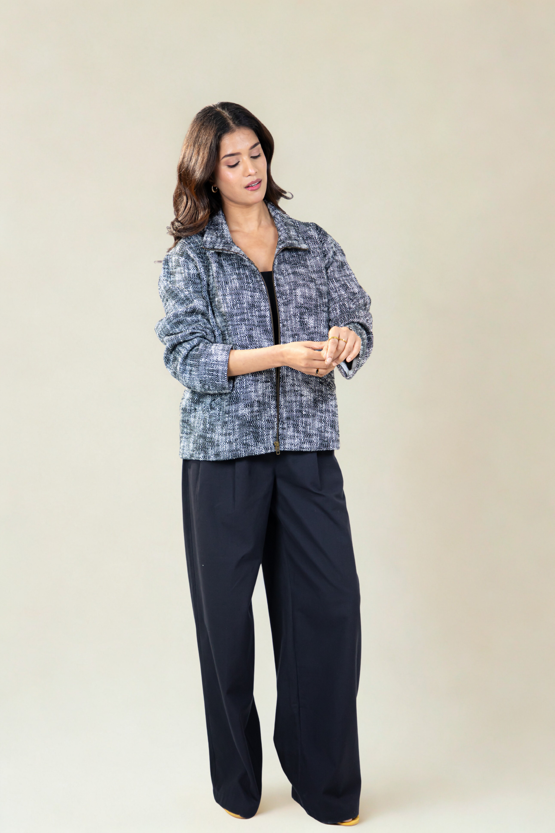 The silhouette is intentionally loose and slightly oversized, allowing it to sit comfortably across seasons and styles. Thoughtful details like a clean zip front, functional pockets, and a soft standing collar make it an instinctive choice.